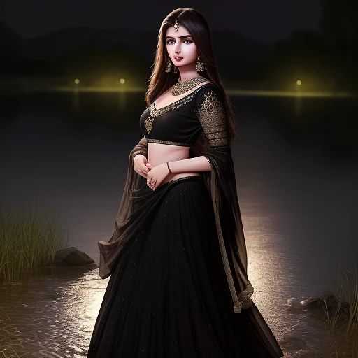 Hyper realistic potrait of a girl who looks like tara sutaria, pakistani actress model, no dark circles, wearing natural makeup, wearing a black lehenga, full body potrait, no NSFW, near a pond, night scene beautiful