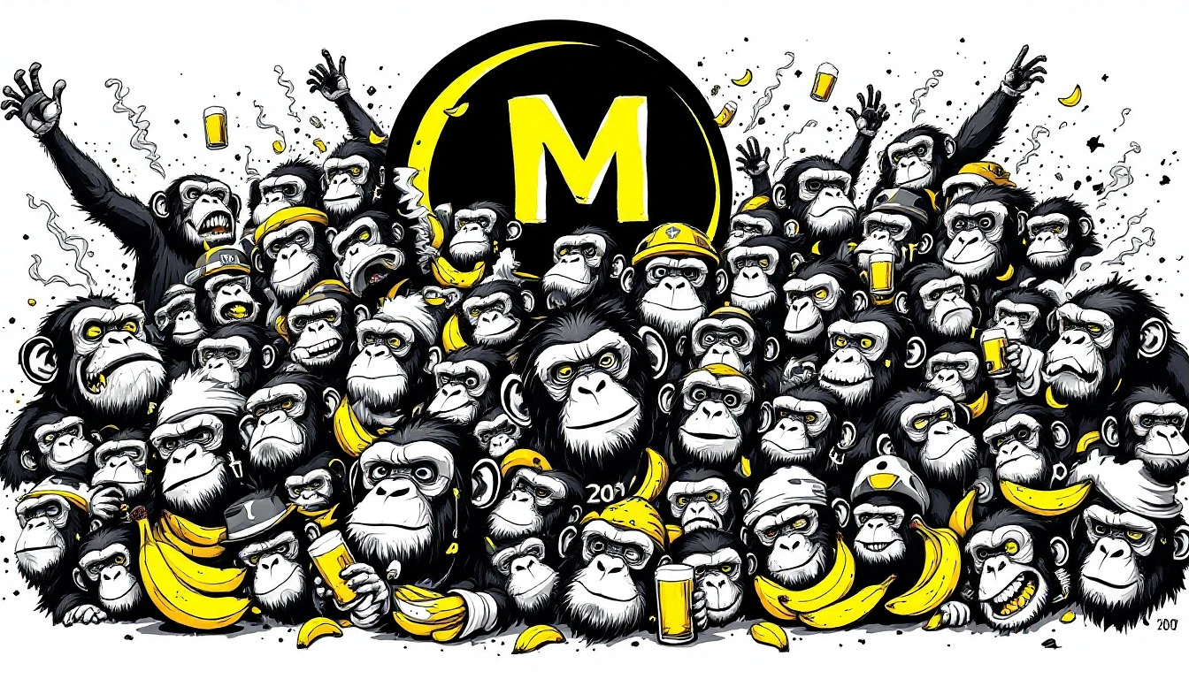 An intricate and mainly black, white, yellow, green, (two contrasting, extra colors for details) , graffiti-style poster featuring various elements, such as 30 chimp cartoon characters, symbols of urban culture, smoke and dynamic expressions, focusing on minimalistic chimp faces, the letter 'M' inside a large circle, bananas, beer, is part of the image. the word and '2007' is hidden --ar 63:128 --stylize 750