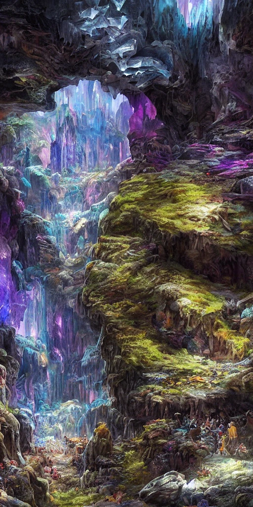 ultra realistic illustration and highly detailed digital render of panorama view in a dark underground cavern rich in huge colorful crystal deposits by greg rutkowski and kinkade, colorful crystals, highly detailed, vibrant and vivid, smooth, crystals, gems, geode, darkness, minereal deposits, cinematic, high contrast, hdr, 4 k, trending on artstation, unreal engine, magical, hyperrealistic, bokeh, dof