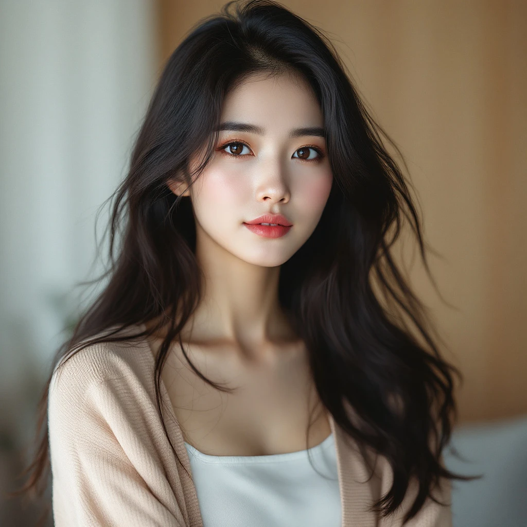 East Asian Sophistication in Soft Pastels A 28-year-old East Asian woman with long-length, silky black hair and diamond-shaped dark brown eyes. She has a fair complexion and wears a simple pastel beige cardigan over a white top, effortlessly chic. Her expression is neutral, yet serene. The background is a softly lit modern interior setting with natural wood tones. Shot in hyper-realistic quality using a Canon 35mm lens.