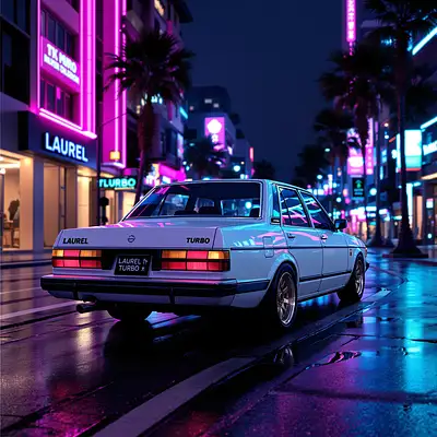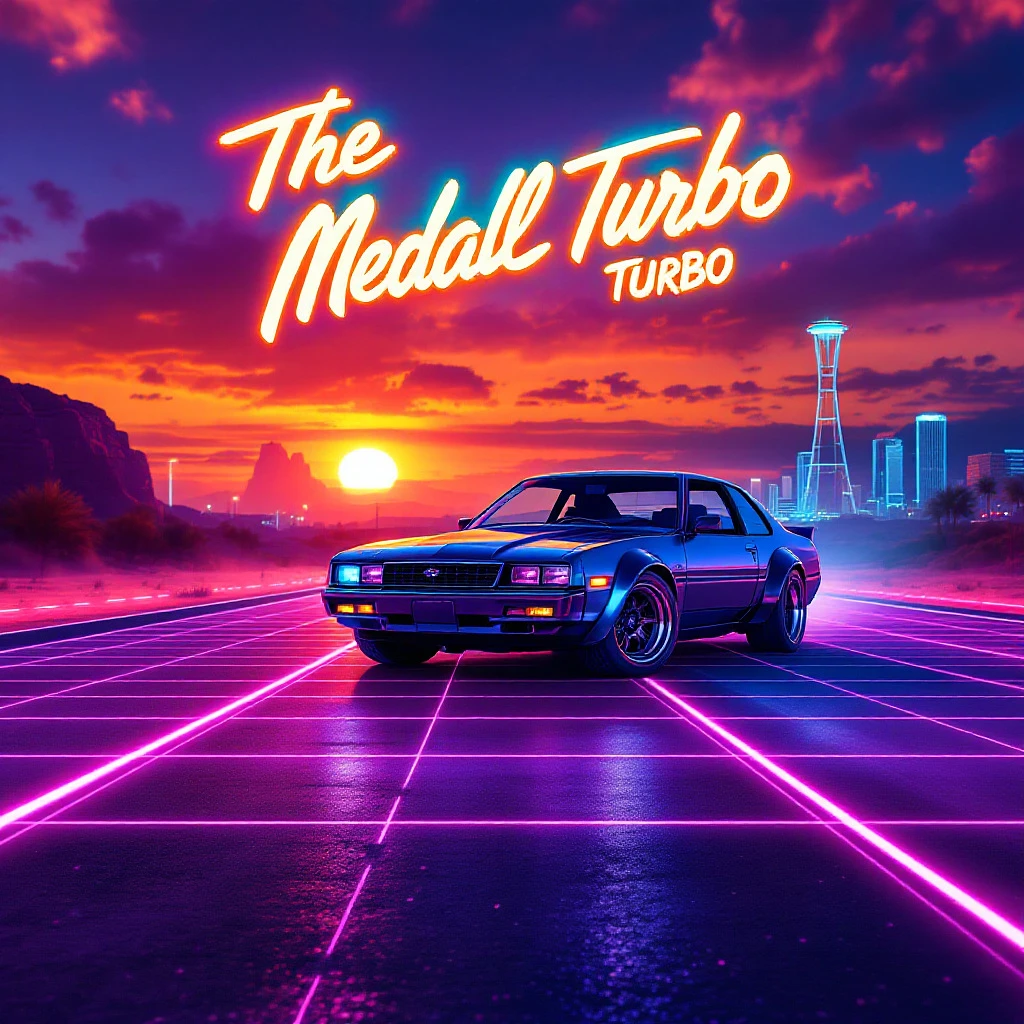 A 1980s-style synthwave wallpaper of the Nissan Laurel Medalist Turbo, parked on a glowing desert highway at sunset. The scene features vibrant neon lights, a retro-futuristic grid landscape extending to the horizon, and a distant Miami-style skyline. The sky is painted with deep oranges, purples, and pinks, capturing a dramatic sunset. A glowing VHS-style text overlay reading 'The Medalist Turbo' appears in chrome font with scanlines and static. The entire composition is rendered in ultra-high-definition 4K, emphasizing rich synthwave colors, lens flares, and a nostalgic 1980s atmosphere.