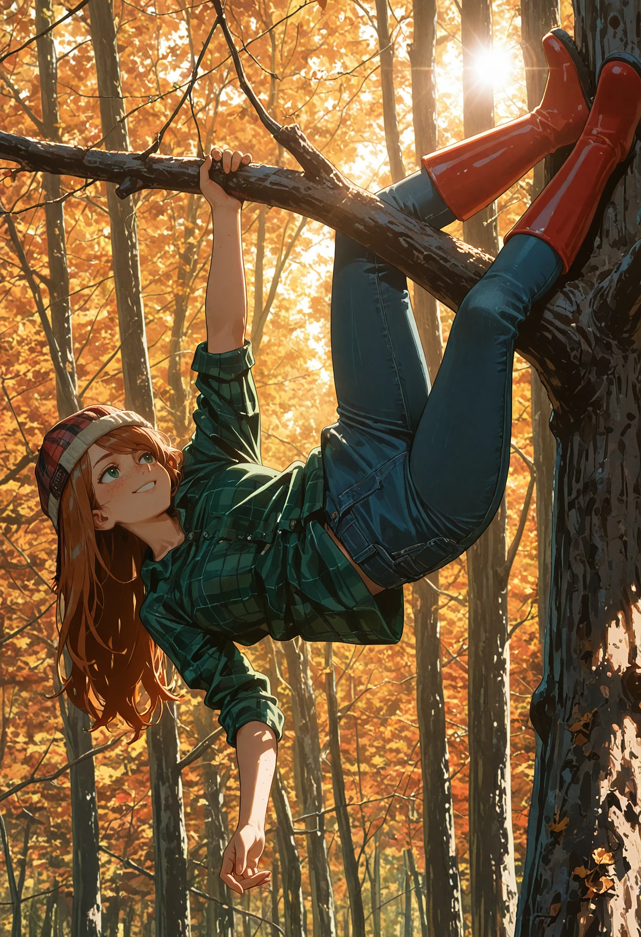 masterpiece, best quality, amazing quality, very aesthetic, absurdres, newest, scenery, anime coloring, 1girl, solo, (wendy corduroy:1.2) , auburn hair, long hair, swept bangs, green eyes, detailed eyes, freckles, smiling, casual clothing, flannel, flannel shirt, green shirt, rolled up sleeves, sleeves past wrists, jeans, rubber boots, winter boots, trapper hat, lumberjack hat, hanging from tree, upside down, playful pose, dynamic pose, hand up, one hand hanging, forest, woods, autumn leaves, autumn colors, outdoors, trees, tree branch, nature, daylight, lens flare, looking to the side, looking away,