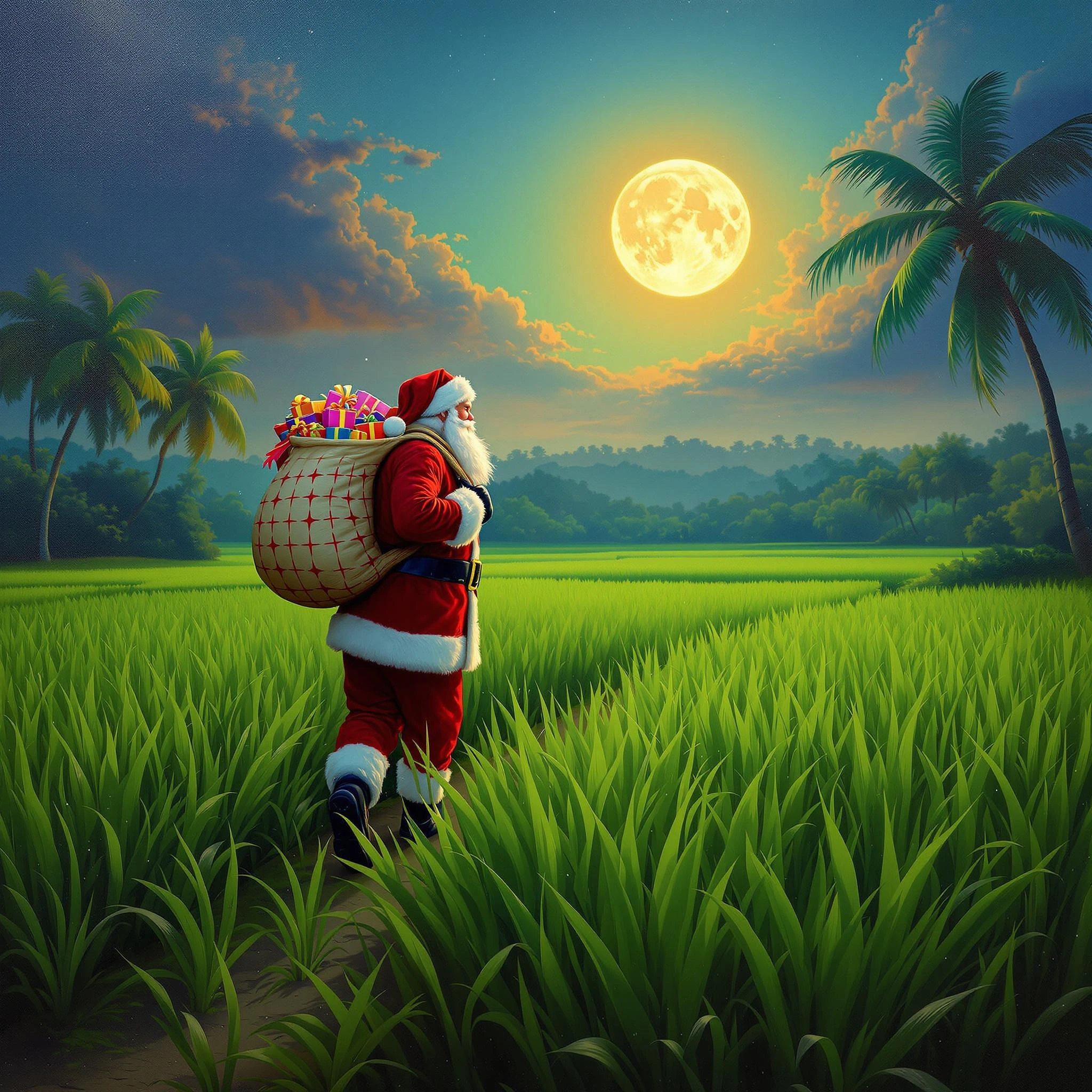 Photo realistic image of Santa Claus, carrying a sack of gifts, strolls through a serene Kerala paddy field under the glow of a full moon. The familiar figure contrasts beautifully against the lush green backdrop, his traditional red and white attire shining in the moonlight. The scene, depicted in an exquisitely detailed painting, captures the magic of Christmas and the enchanting beauty of nature. Rich, vibrant colors and intricate textures bring this heartwarming image to life, evoking a sense of wonder and joy. Shot on canon 5d mark 4