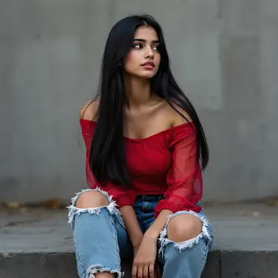 A indian girl, 16, is seated on a wide step with her legs crossed. Her straight long black hair frames her beautiful face. She's wearing a semi sheer off-the-shoulder red top and torn blue jeans, exuding a casual yet stylish vibe. Her gaze is directed off to the side, suggesting she might be lost in thought or observing something out of frame. The background is minimalistic, featuring a gray concrete wall that adds an urban feel to the scene. The lighting is soft and diffused, casting gentle shadows on her face and clothing, which enhances the overall mood of the image. Seed-5753, Model-FLUX flux-1.1-pro