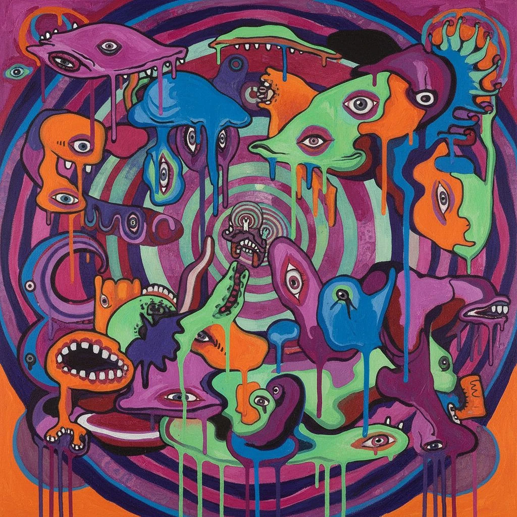 psychedelic, simplistic, surreal. surrealist painting by Pablo Picasso, striking and beautiful images, dripping, melting strange creatures, striking colors --q 2 --s 750 --v 5. 2