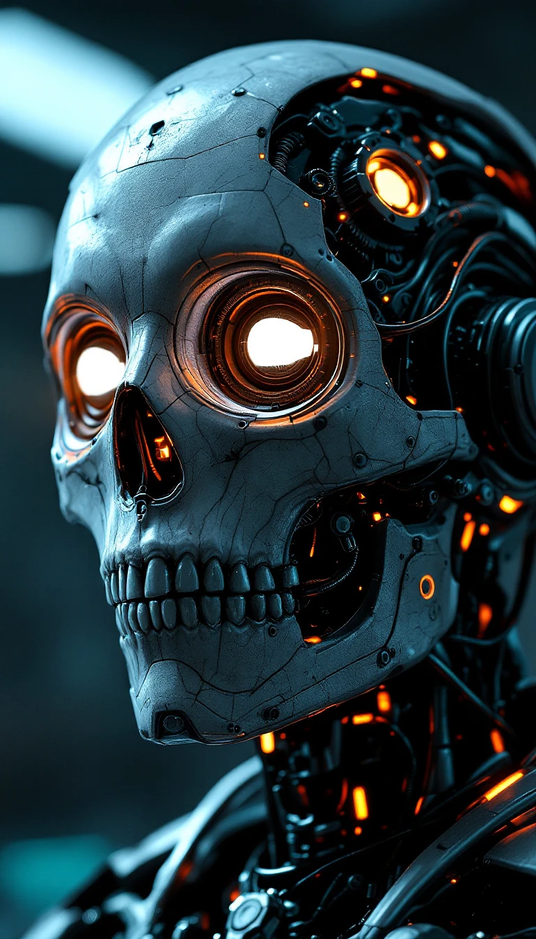 Create a hyper-realistic, futuristic humanoid cyborg with a partially exposed mechanical skull. The cyborg’s face blends human-like bone structure with worn, scratched metal plating, revealing complex inner mechanics beneath. Its glowing white eyes feature digital elements and internal lenses. Visible wires, gears, pistons, and tubing run through the head and neck, with warm orange light emanating from internal sources. The textures are highly detailed, showcasing weathered metal, bolts, and robotic joints. The background should be dark and blurred, with dramatic cinematic lighting focusing on the cyborg. Render the scene in 3D with ultra-high resolution, shallow depth of field, and sharp contrast between the cool metallic surfaces and the warm glow from within.