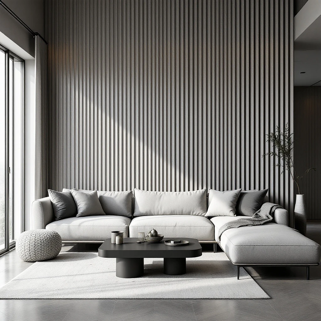 family lounge area that exudes comfort and style, soft gray sectional sofa centered around a minimalist black coffee table, behind the sofa, a full-height corrugated iron wall painted in light gray adds a textured backdrop, natural light filters through blinds, casting soft shadows and contributing to a relaxed atmosphere, UHD, expert, ultra resolution rich detail --ar 9:16