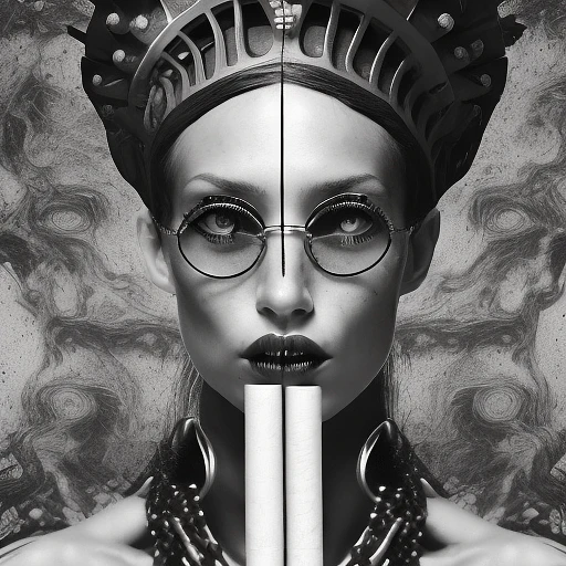 200mm portrait RAW photo - Detailed high resolution black and white photo photography of an attractive futuristic steampunk woman with freckles, wearing big round mirrored sunglasses in which the Statue of Liberty is reflected, a bandana around her neck, tattoos on her arms, smoking a cigarette, looking straight ahead, like an old school tattoo art --ar 73:105 --stylize 750