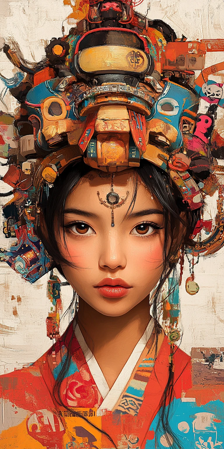 A full-body portrait of an Asian woman with big shiny eyes, very large expressive lips, and colorful tattooed hair wearing a huge headpiece in the style of James Jean, highly detailed faces and bodies --ar 1:2 --personalize 2gwf1qc --stylize 750 --v 6. 1