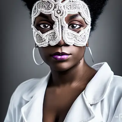 photography, high quality, half body portrait of black woman as a doctor, blue scrubs and white coat, intricate, beautiful and elegant, highly detailed, smooth, sharp focus