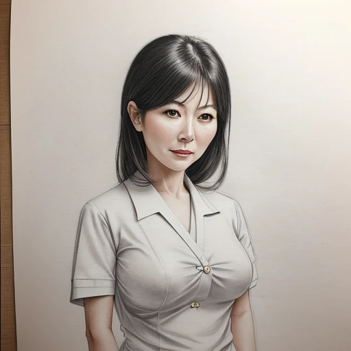 masterpiece, raw photo, realistic, milf mother mature japanese, uniform korean, light natural tones , pencil drawing , watercolor drawing