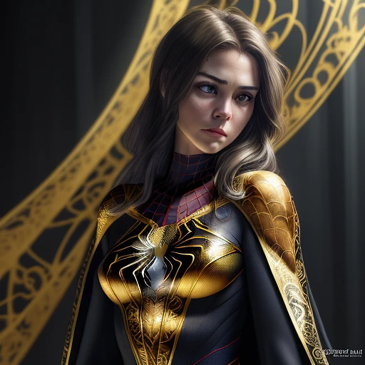 hyper realism, beautiful spiderman girl, photo realistic, detailed, art nouveau, girl like Alex Garland, wearing a golden and black robe with calligraphy on it, ultra detailed, photorealistic, highly detailed, cinematic, 32k --ar 9:16, winning studio photography, profesional color grading, soft shadow, no contrast, clea sharp focus, film photography