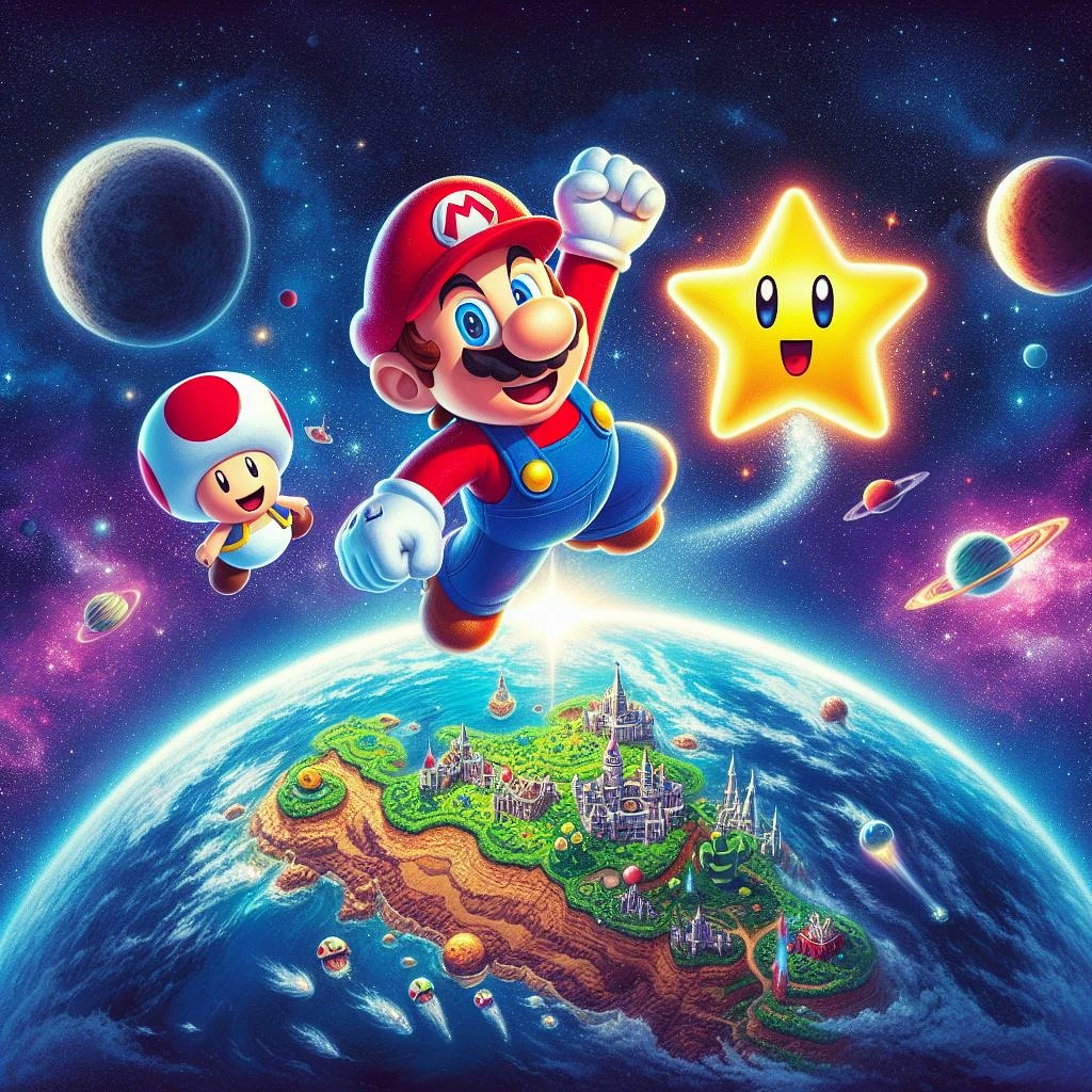 Super Mario está sobrevolando el planeta del reino champiñón en el espacio con su acompañante la estrella, como en la portada de Super Mario Galaxy