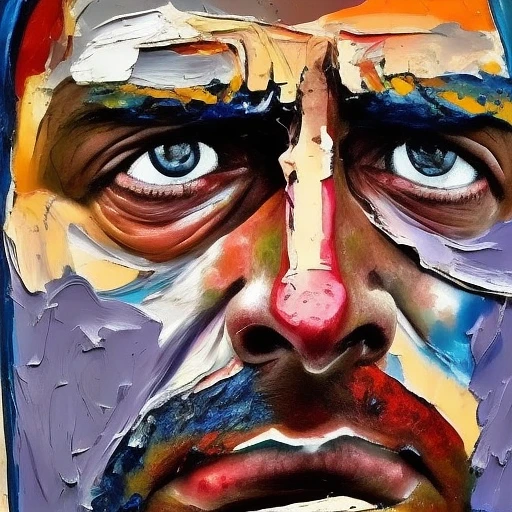 painting of sad man face, eyes are teary, holding face, pallet knife painted, thick textured, thick layers of paint