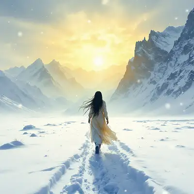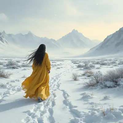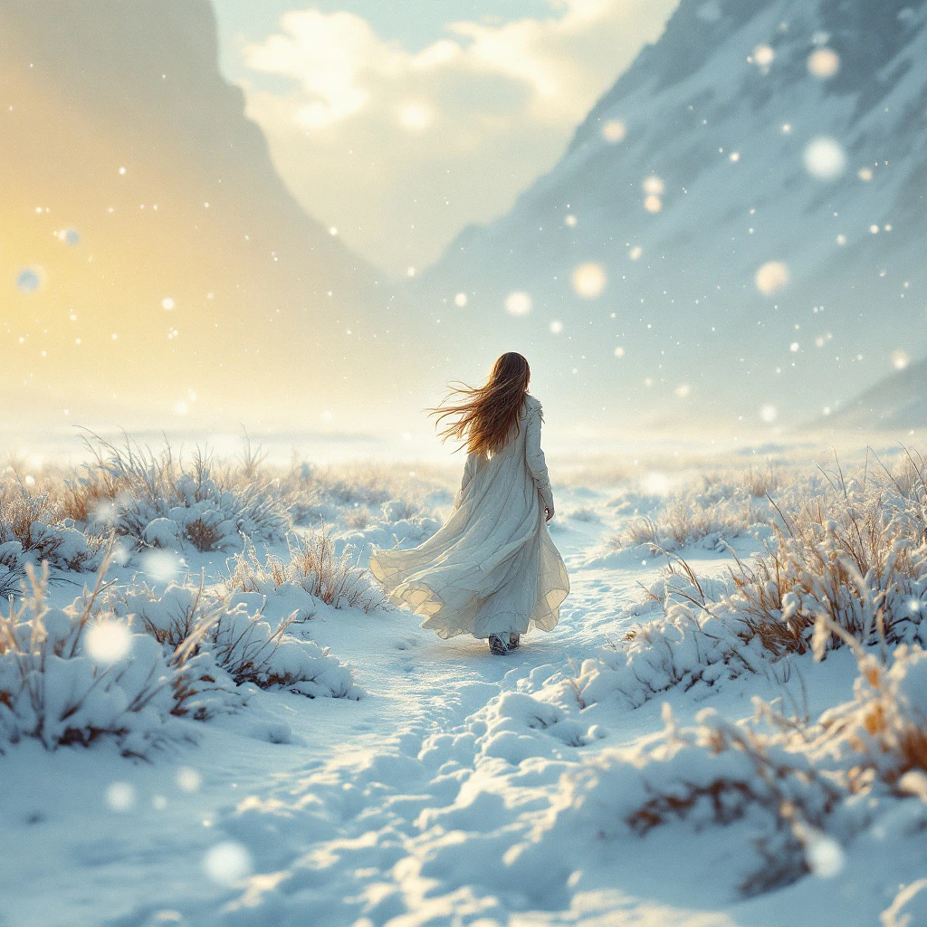 a woman with long hair walking through a frozen landscape with snow fall, in the style of cinematic montages, dragon art, franciszek starowieyski, yellow and white, john howe, hyper-realistic details,