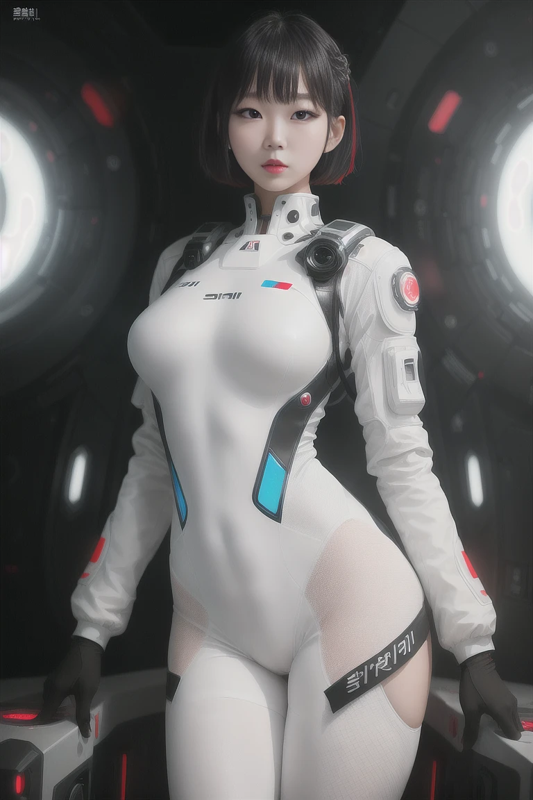 (1girl) , (full body) , (white futuristic sci-fi bodysuit) , Beautiful Korean woman, kpop idol, (Cute Loose Bob hairstyle) , symmetrical eyes, realistic, sharp focus, HD, highly detailed, intricate, photography, hyperrealism, hyperrealistic, film, studio portrait, detail, dramatic lighting, (red lips) , (small breasts)