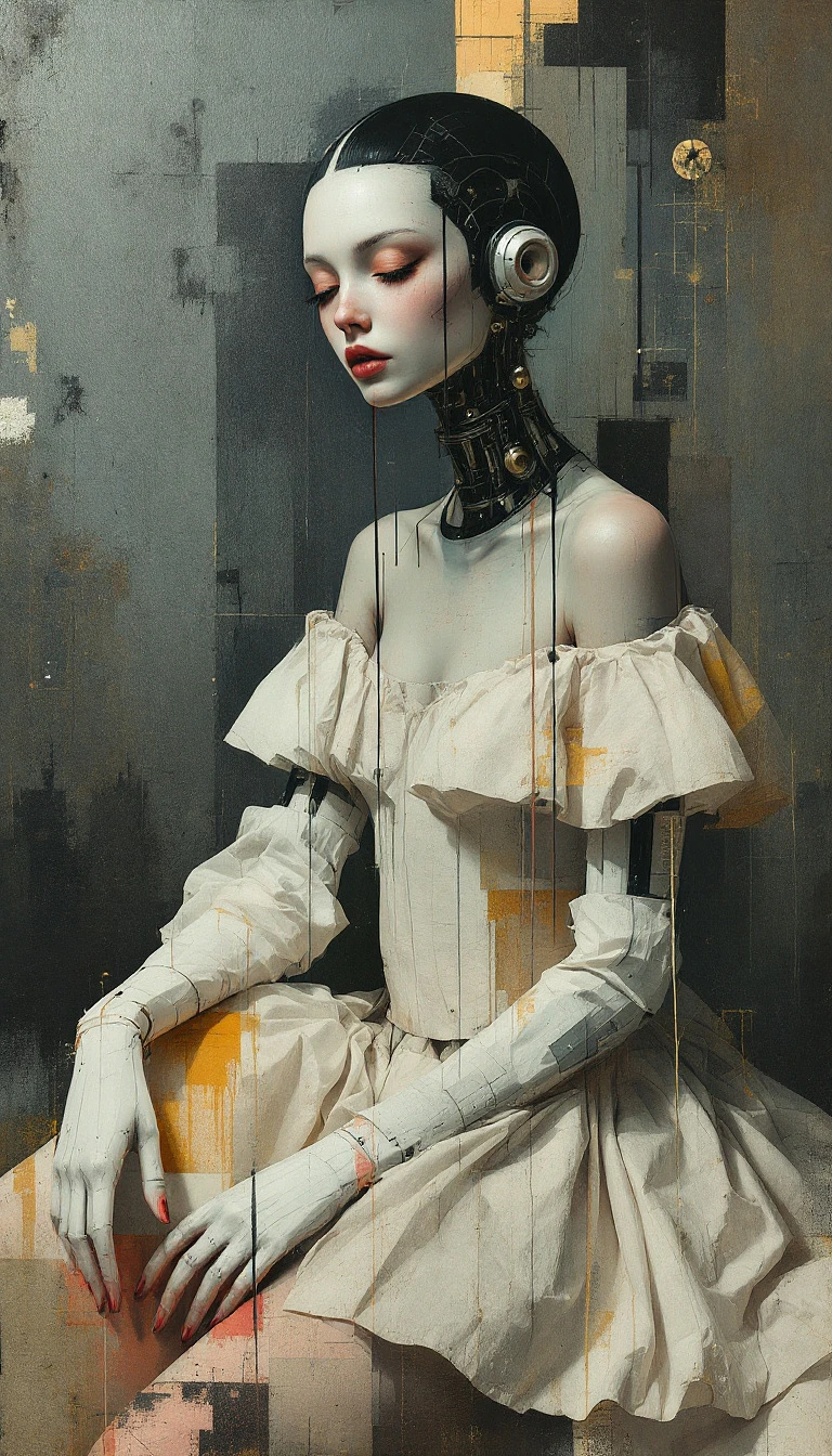 Mixed media artwork + Emotional cyborg girl + Elegant dress, In the style of surrealist expressionism, muted color scheme, dreamlike atmosphere, abstract and distorted forms -