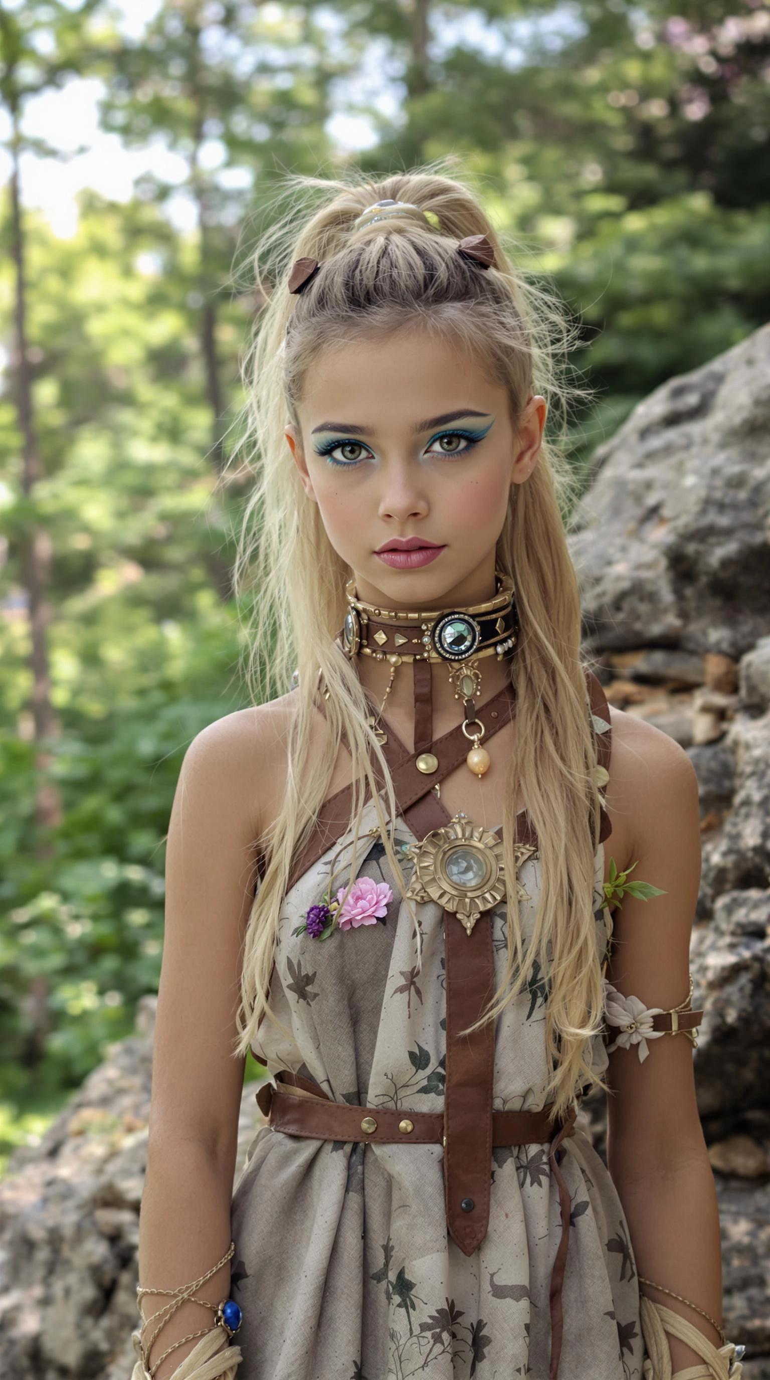 a professional photo of a exceptionally beautiful girl in the world, (nine year old) , ( age 9) (futuristic) , (masterpiece) , (realistic) , (perfect anatomy) , (Full body viewing from head to feet) with extremely long Dark Caramel Blonde hair tied back into a pony tail, flawless olive skin, thick blue eye liner, extra long eye lashes, light pink blush, extremely beautifully shaped lips with light apple lipstick, blue eye shadow, flawless light olive skin, extremely detailed large beautiful brilliant Forest Tea red-green-blue-silver-brown-golden-grey eyes, (dressed in in the style of prehistoric cavemen) , standing rock ledge on a hot summer day, surrounded by a forest high depth of field, gentle expression, 8k, (high res) , ultra-detailed, photo-realistic, full image view, full body view, front view, highly detailed, volumetric, dramatic lighting