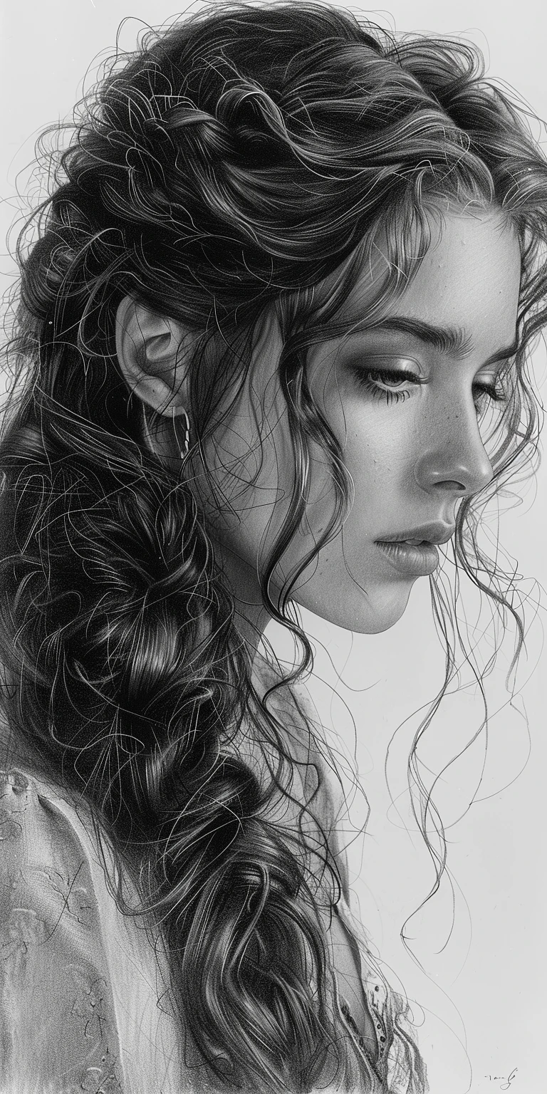 pencil sketch, woman with long hair, hyperdetailed --ar 1:2 --stylize 750