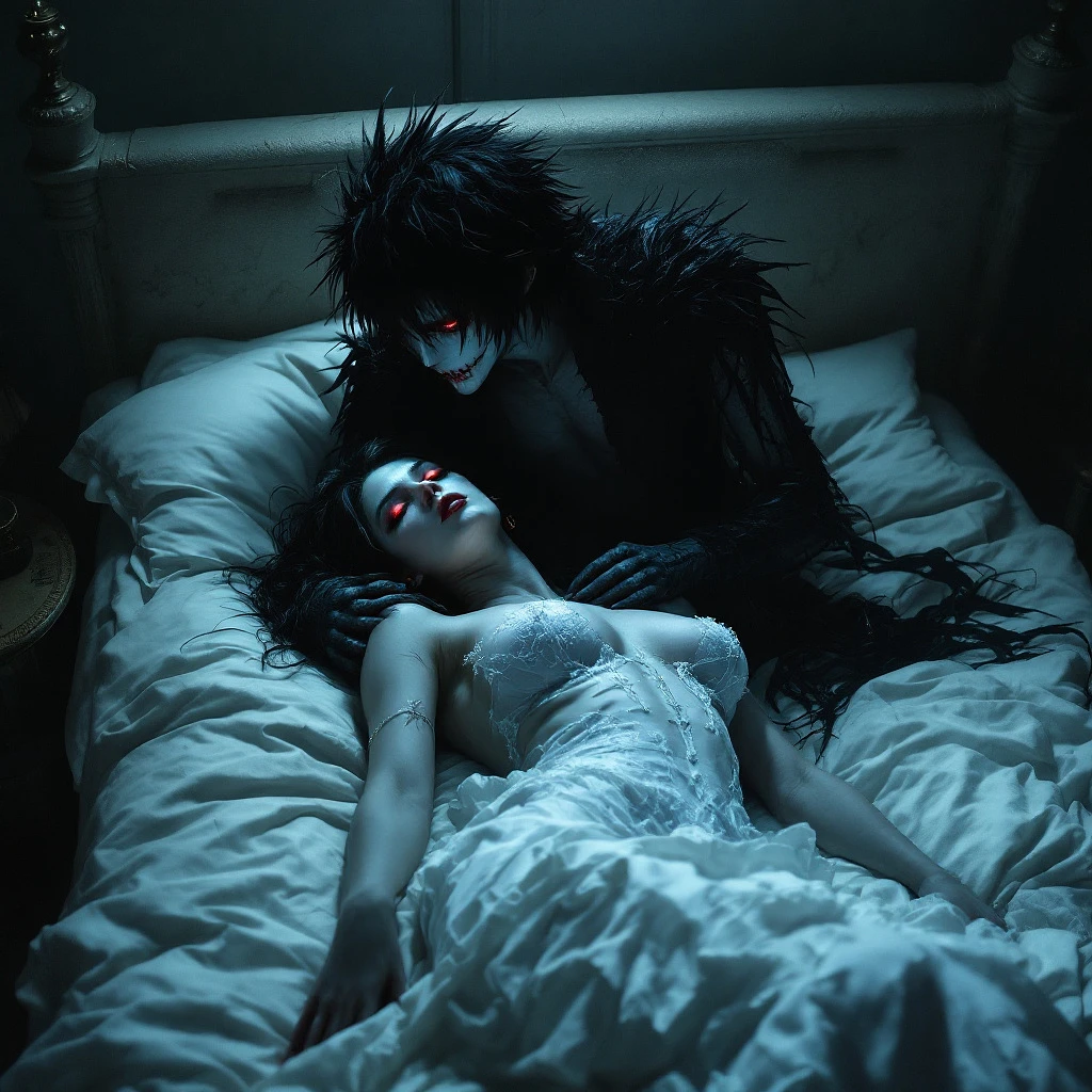 le monstre de Death Note Ryuk menaçant, surplombe une très jolie jeune femme épaule découverte body dentelle rouge visage éclairé allongée sur un lit baldaquin dans une chambre très peu éclairé ambiance feutré
