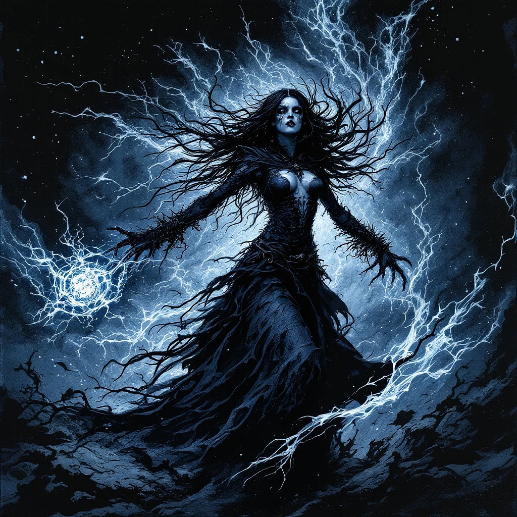 in cyanotype art style, Arkthar the chaos necromancer (female character) , spreading fear and confusion like the wind spreads the seeds of evil, masterpiece, in the style of detail-oriented. Horror and dark fantasy.