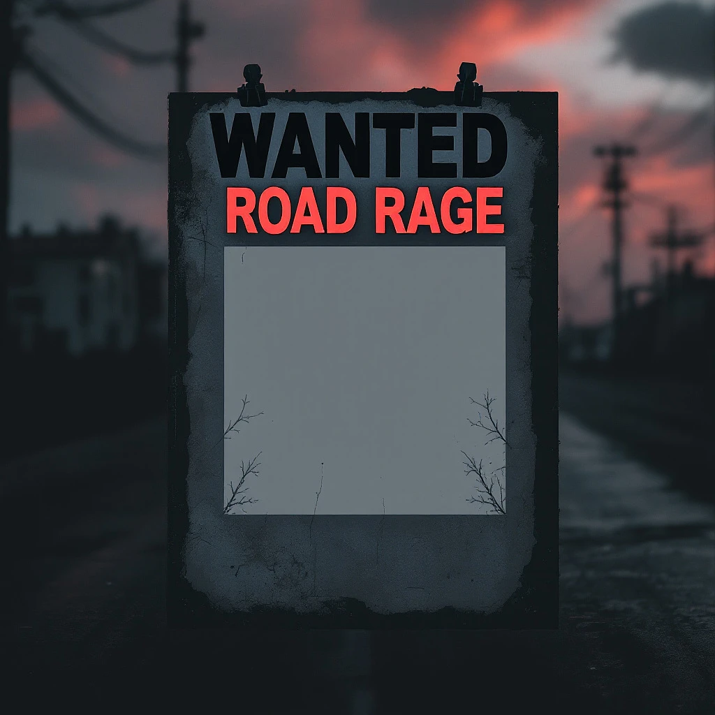 Sinister Wanted poster for road rage with a 1:1 empty square for a picture to be placed, symmetrical artwork. cinematic, hyper realism, high detail, octane render, 8k