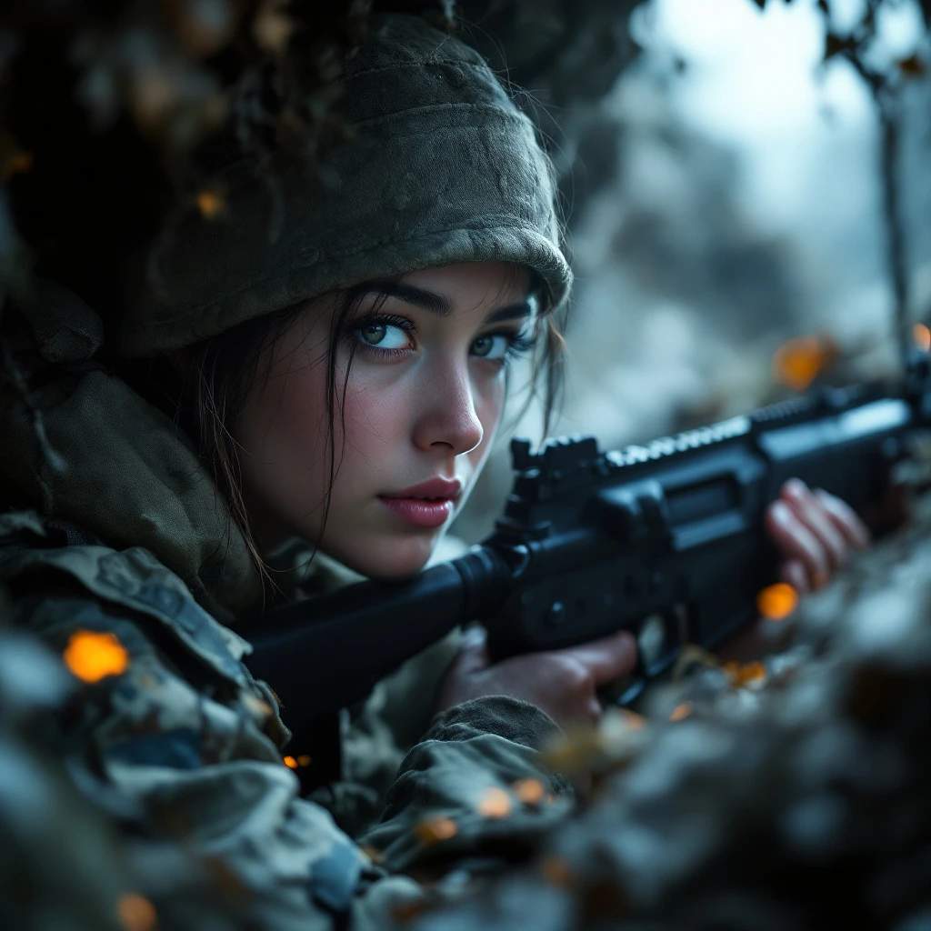 a pretty young female soldier , in a foxhole, gripping the rifle tightly, with a photorealistic style featuring intricate details and cinematic lighting, depth of field and volumetric effects, in 8K UHD resolution.