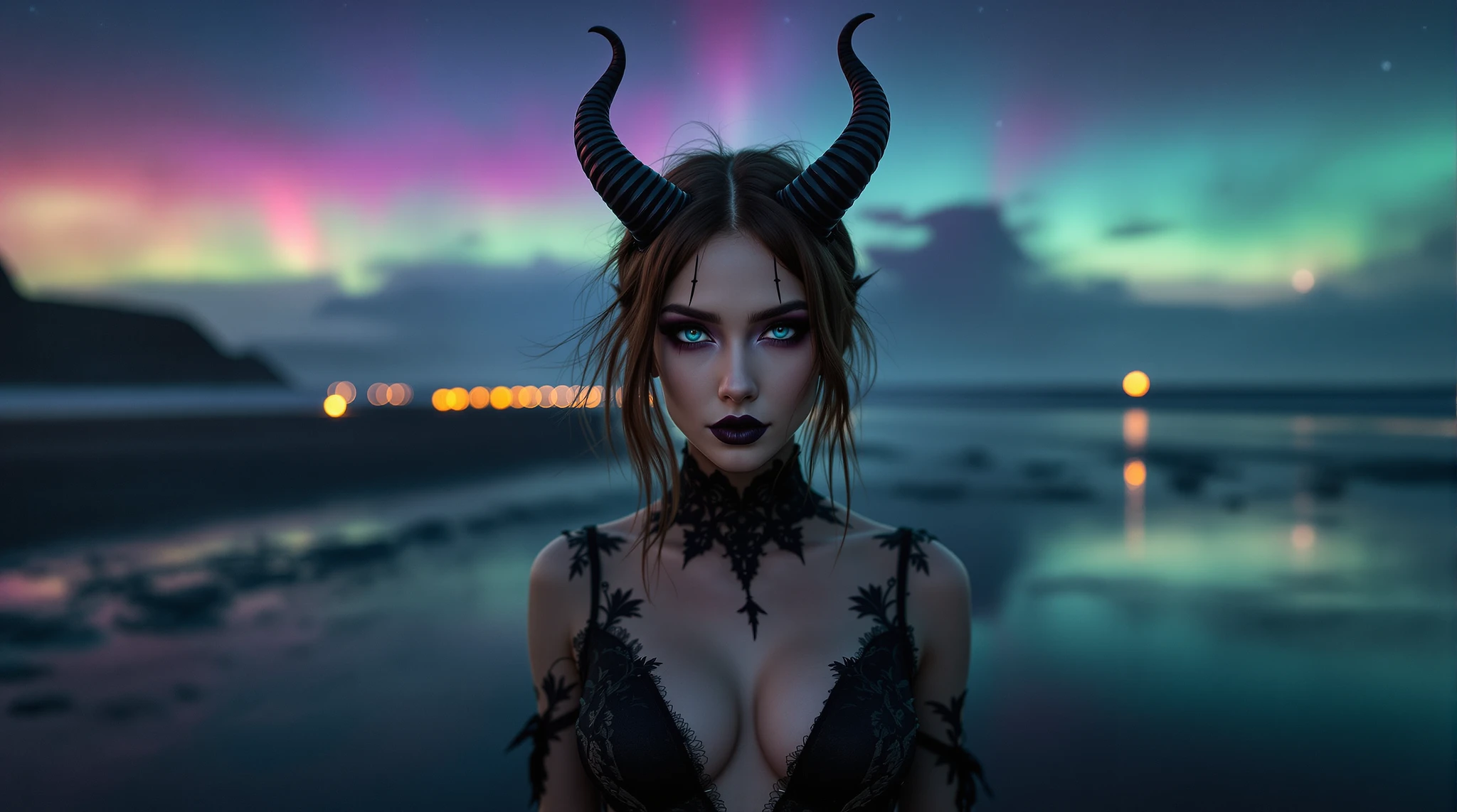 Distant view, wide angle photo of A female Cambion ( age: early 20, deep blue eyes) humanlike ears helix'. Her toned, athletic physique while her short brown hair runs down to her shoulders, frames her beautiful oblong face. small, horns protrude from her forehead. Her eyes sparkle with creative joy and compassion. Soft gothic makeup with a touch of purple/burgundy tones (Wednesday Addams) . her shiny skin reflects the light like sparkling diamonds. she is clad in a slim dress (Dress fabric: sheer black with intricate details) accentuating her curves. simple gothic jewelry ). She walks towards the lens on a starlight black beach of Reynisfjara, Iceland, at night watching the mirrored calm seas. Aurora borealis lights up the sky a path of lit torches lights her up