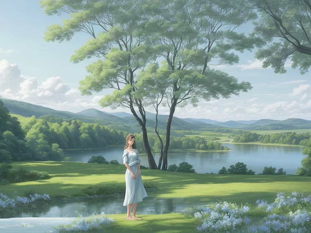 The background is a picturesque landscape with rolling hills, trees, and a body of water in the distance. The sky is a soft, serene blue with wispy clouds, and the lighting is soft and diffused, with a warm glow that suggests a sunny day. The overall effect is one of peace and tranquility, with the woman's elegant pose and the serene natural setting combining to create a sense of calm and serenity.