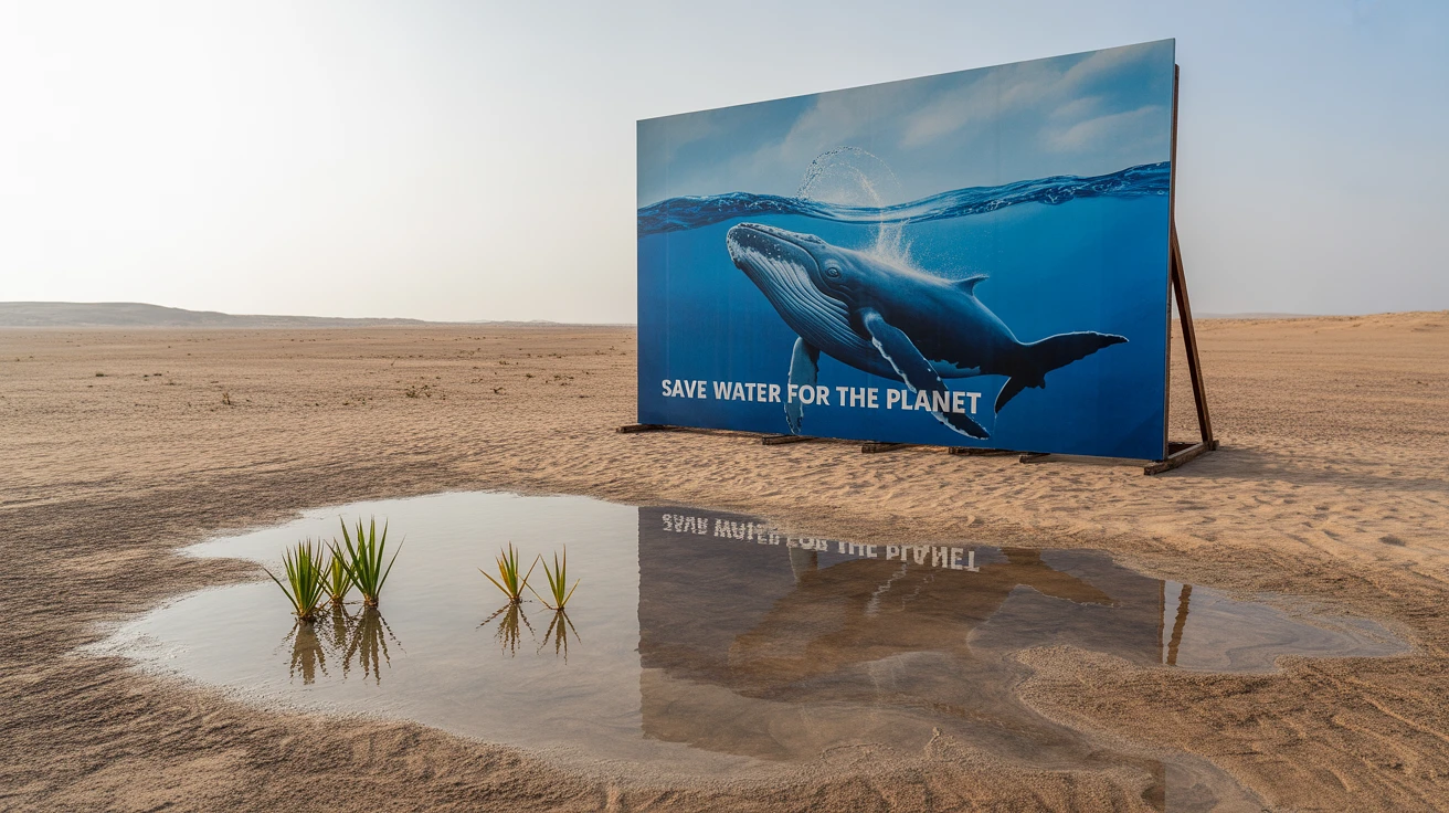 close up view In the desert, of a giant publicity panel displays a whale painting with water splash with a slogan "Save Water for the planet" Nearby, scattered water pools on the sand, with a few plants growing, symbolizing conservation under the scorching sun. very fine details and textures