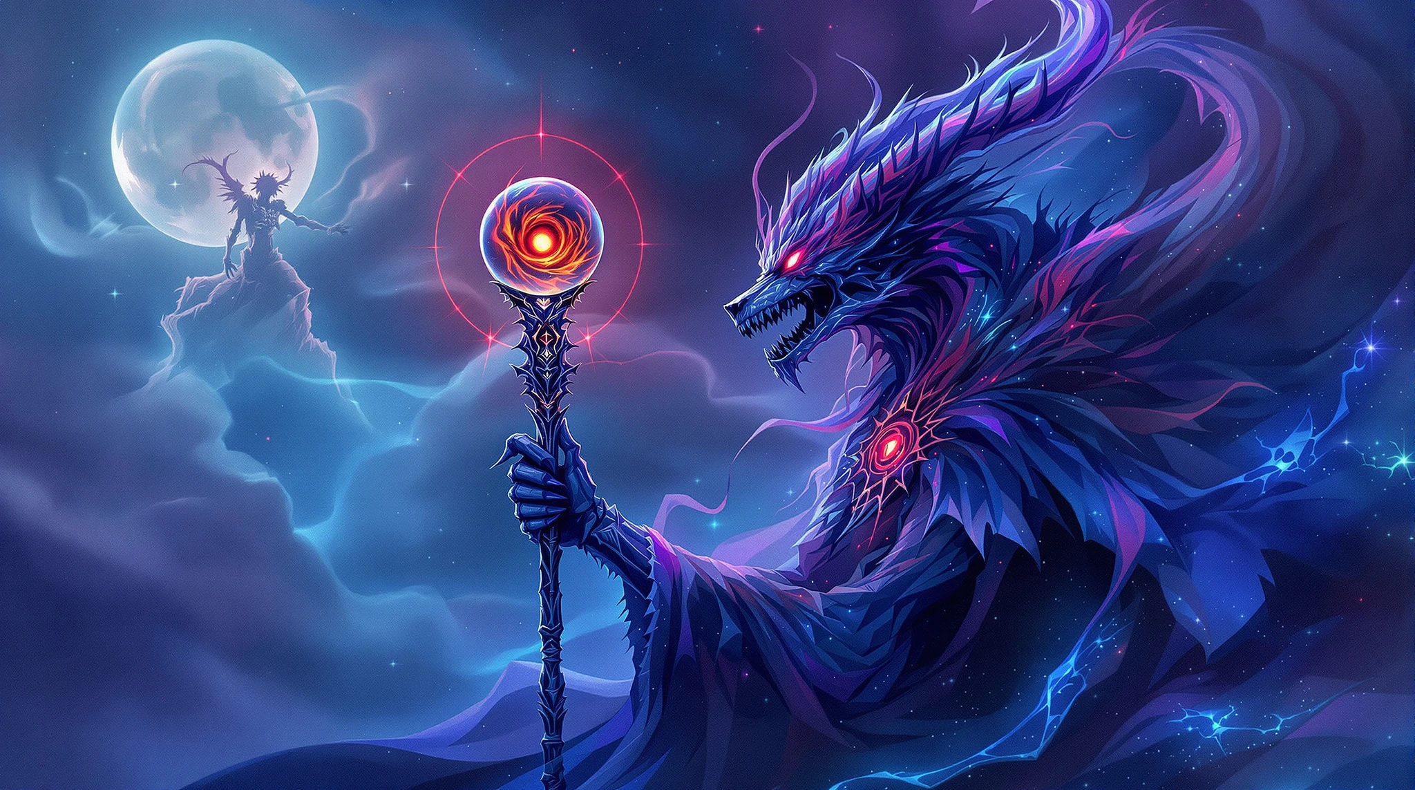 "Tantaelii Blessing" "Sofna upp fra", "Sofna Hedon", "Sofna. "You are the Bloom of Blooms", "fair of face dark of heart". "Bringer of Woe", "consort of Demons". Tantaelii mercy stains the land in shadow. The character weilds an Aetheriusbound elemental Staff, that has arcane symbols, a pearlescent glow, with swirling nebula and galaxies the length of the staff in glistening midnight blue and dark purple hues, situated atop the staff is a clear crystal globe, within the globe is a flaming demons eye that is within a swirling galaxy, a faint red luminous glow surrounds the top of the staff. Destruction and corruption are forms of creation in themselves. Sensitivity and subtlety are required to appreciate the inherent beauty that is Chaos. twilight, dark of the moon, ritual, shadowy demon and skeletal wolf form in the background mist. alcohol ink wash diluted bloom, organic fluidity detailed watercolor illustration
