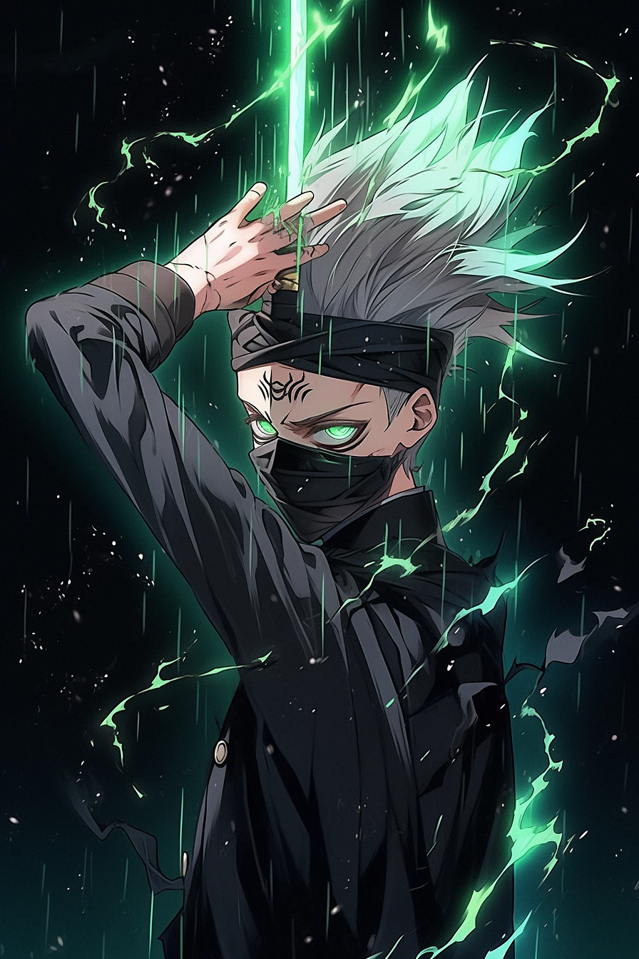 A mischievous ninja in a sleek black outfit adorned with silver symbols, holding a lightning-patterned sword, piercing green eyes, epic lightning and air bending shot, Gond Painting art, super high detail --ar 2:3 --niji 5