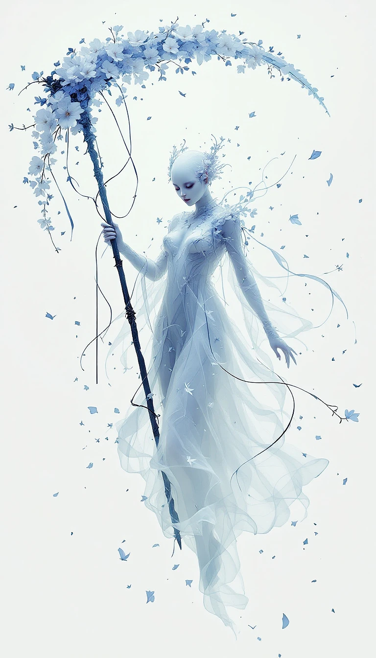 A being who has stepped outside of time floats through a void in reality, wielding a scythe adorned with delicate flowers, against a stark and pure white background. This ghost, has a luminous and ethereal form, with flowing ribbons and delicate patterns. The Matrix-like digital environment has cascading petals and white and blue glitch effects. The artwork features a tilted fantasy and surrealistic dreamscape, mixing elements of Abstract Expressionism with extremely beautiful dark undertones. It aims for a masterpiece with intricate details, and a minimalistic design, with a very dramatic pose. The figure makes eye contact with the viewer in the styles of Greg Simkins and Gerald Brom.