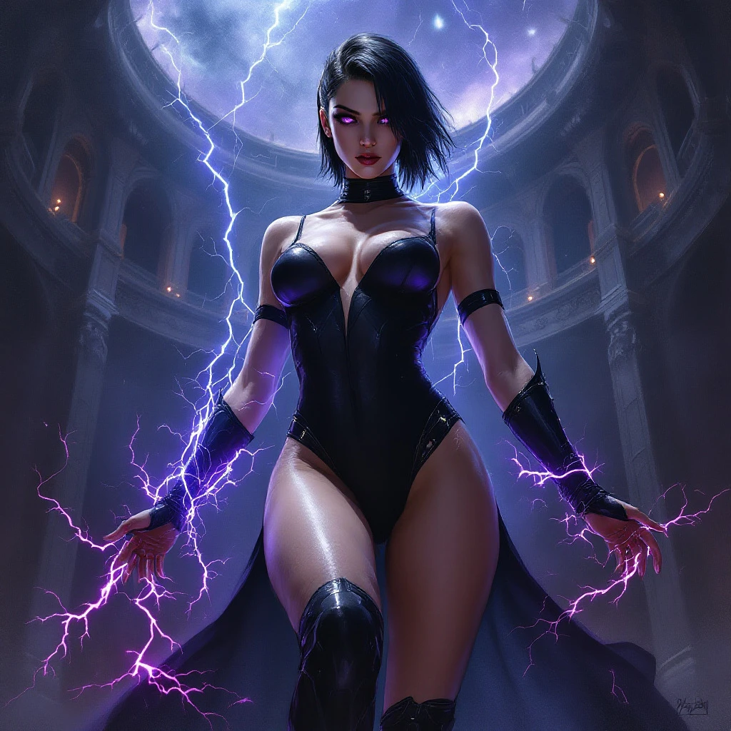 digital oil painting in the style of warhammer 40k of a female comissar, standing infront a gothic circh, channeling lightning magic, cybereyes, black ultra tight onepiece bathsuit, black sidecut hair, very big tits