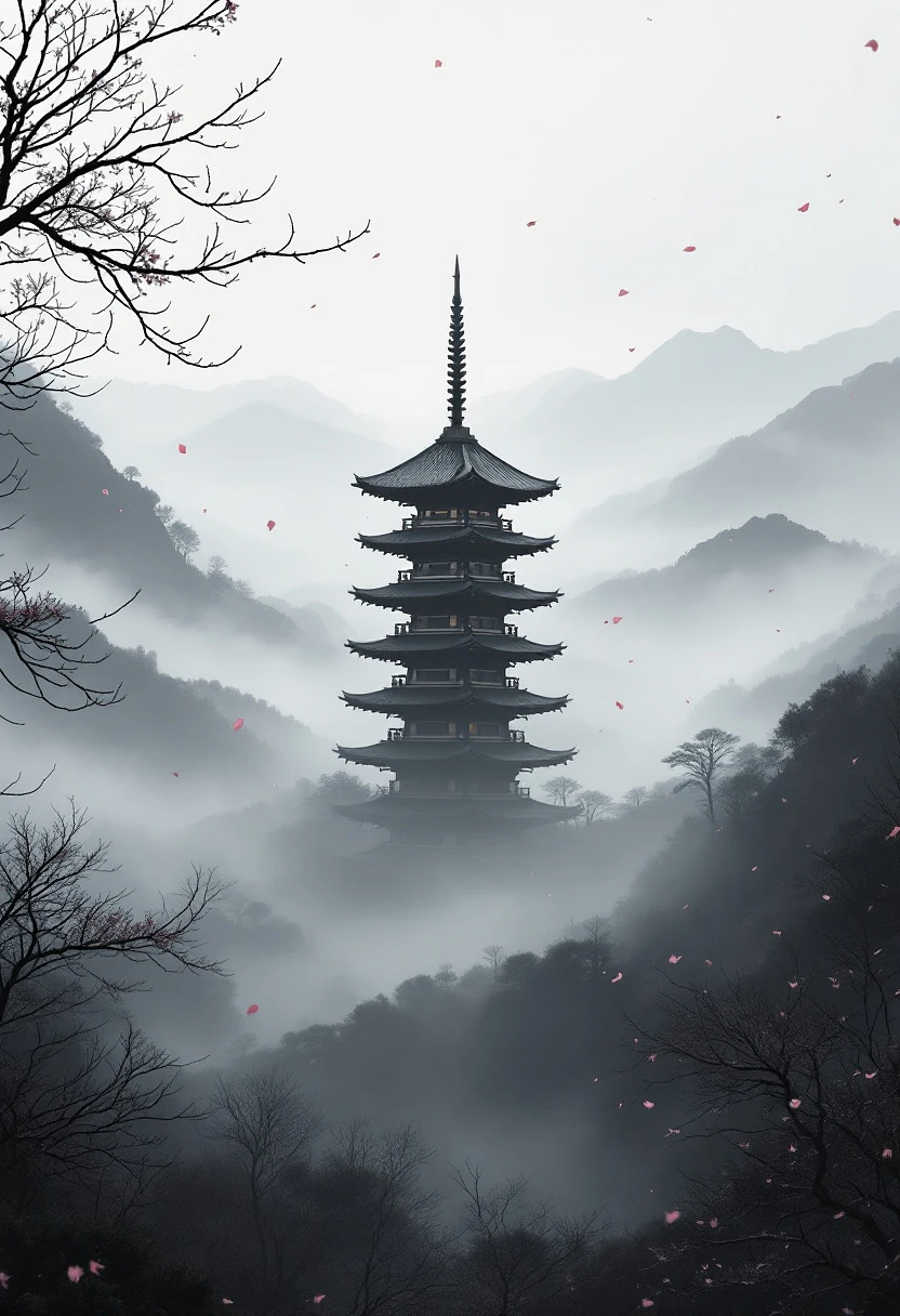 Traditional Japanese pagoda standing tall in a foggy mountain valley, centered mid-range view. Dense mist surrounds the base and rolls through the distant layered hills. Entire scene rendered in monochrome grayscale tones with no color grading, no blue skies. Include a clearly visible yet subtle, muted warm light gently illuminating the interior of the pagoda, softly diffused through the windows or openings to bring a quiet sense of life and presence. Soft pink petals drifting in the air, extremely minimal, serving only as soft atmospheric accents. Bare branches subtly frame the scene on the sides—no full cherry blossom trees, and no foliage obscuring the pagoda. Moody ink-wash aesthetic, inspired by Ghost of Tsushima, cinematic yet understated. High detail in pagoda structure, gentle shadows, calm, and mysterious tone. Minimalist, peaceful composition with deep atmosphere and silence.