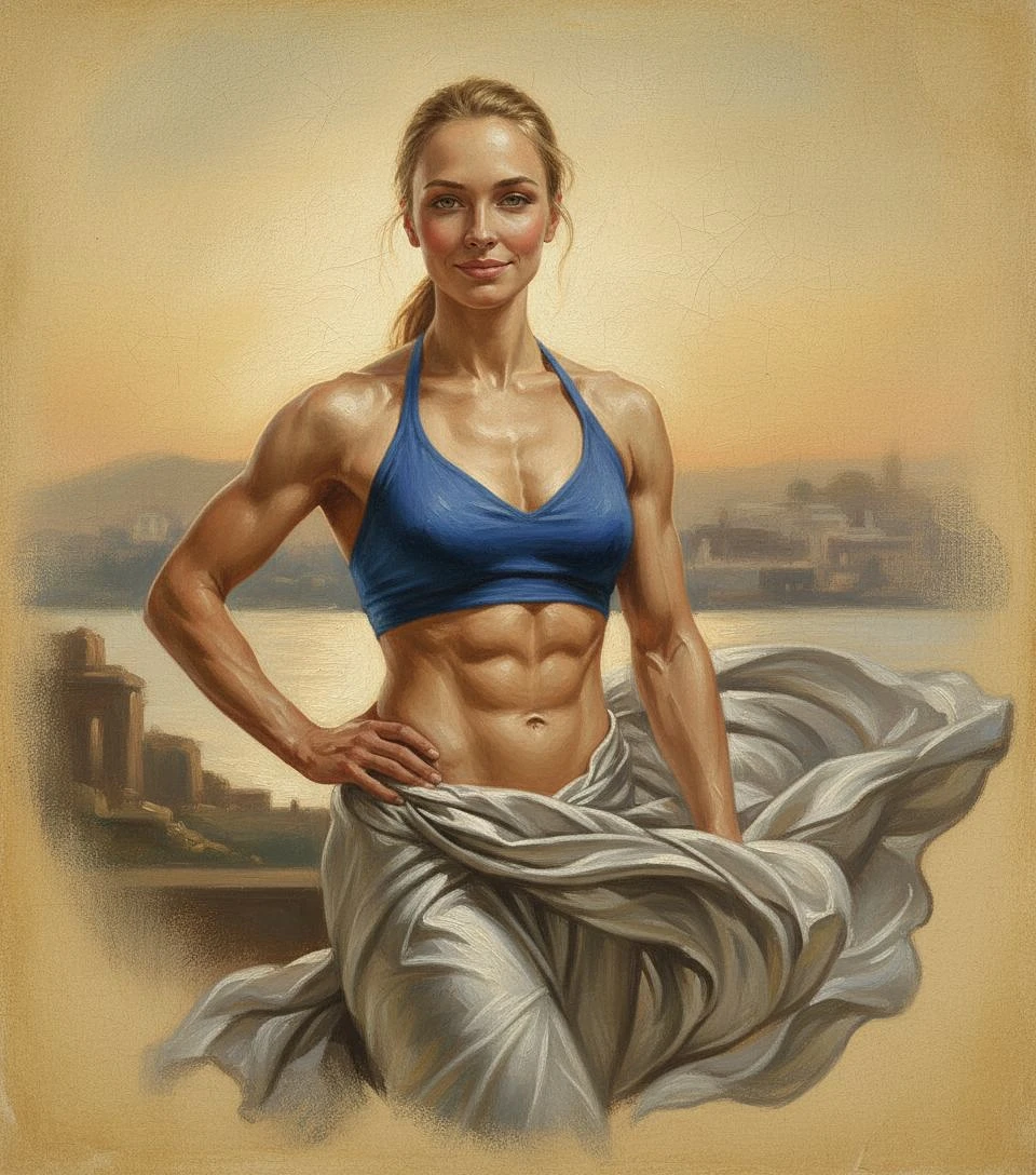 Neo-classical style painting with visible craquelure effect of a muscular woman, wearing a cobalt blue halter top and flowing silver fabric wrap, well-defined abs suggested through traditional glazing techniques. Painted on aged canvas with antique varnish appearance.