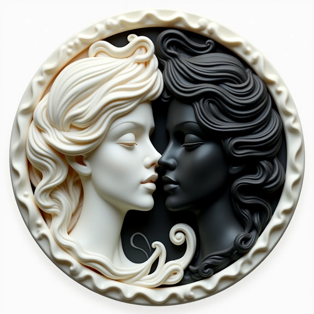 3D round cameo in hte shape of yin yang symbol. the left side is a feminine white face with black hair, le right side is a feminine black face with white hair. The women are face to face , only black and white colors , face only, intertwined , kissing each other, the round white border is decorated in the style of alphonse mucha