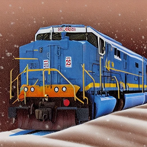 realistic drawing of an emd gp38-2 locomotive machine, in a snowy landscape, with a blue sky, at a crossroads, throwing snow