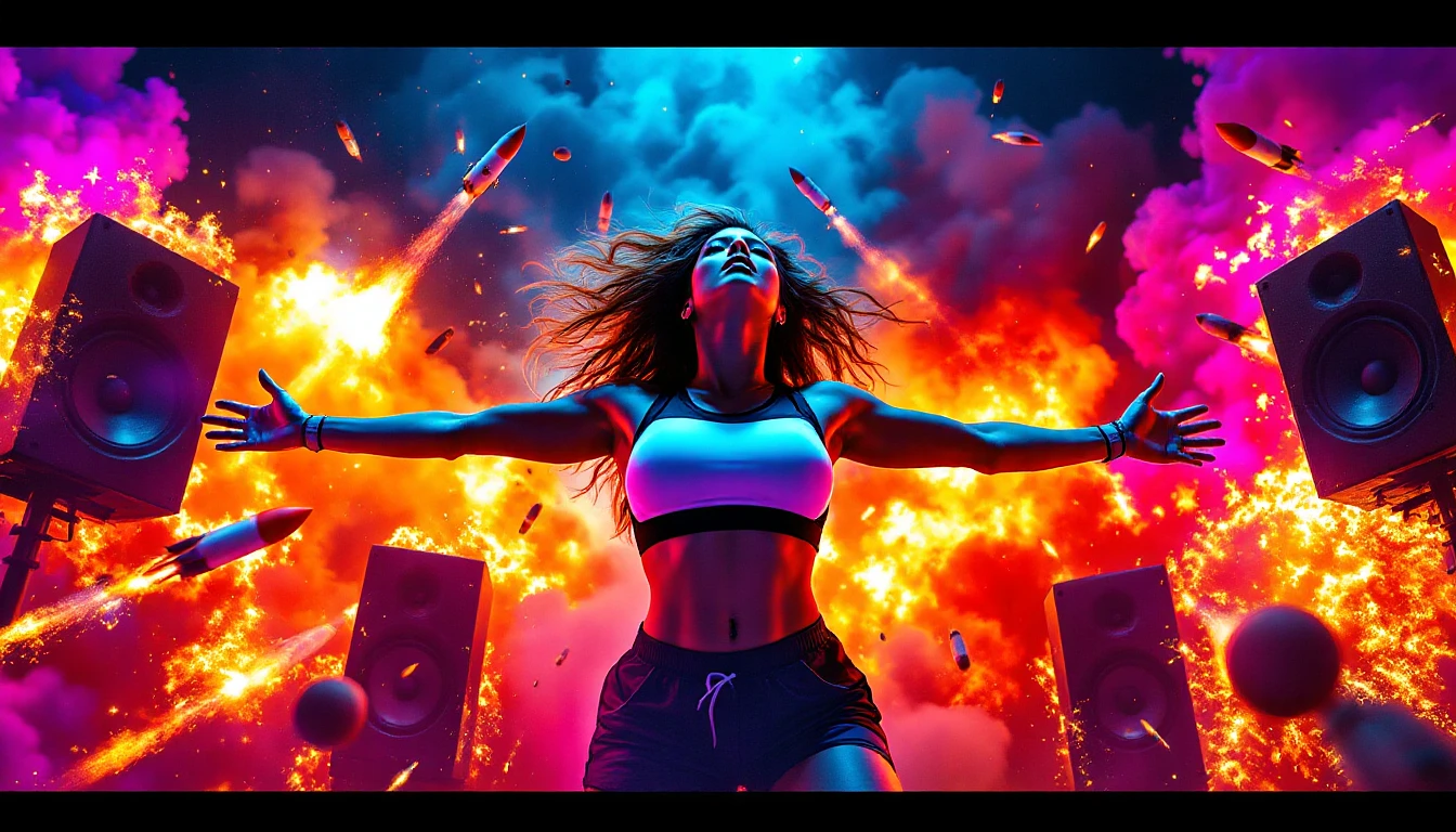 Energetic Stunning Curvy female figure, mid-20s, light skin tone, exhibits dynamic pose with arms outstretched, wearing a black and white sports top and shorts. High contrast vibrant colors, including deep purples, bright blues, and fiery oranges. Intense expression, suggestive of exhilaration. Complex composition, featuring missiles launching amidst explosions and vibrant smoke. Large studio speakers prominently placed on either side of the figure. Heavy distortion and overlay effects are prominent. Fiery orange explosions and plumes of smoke dominate the background. Simulated missiles with visible text are incorporated; a bold dynamic digital art style. Perspective is cinematic, resembling a music video or concert imagery. High-contrast lighting and vibrant colors create a dramatic, energetic atmosphere. Abstract, surreal, and photo-manipulated elements are prominent. The interplay between the figure, missiles and explosions creates a visually striking and high-energy aesthetic.