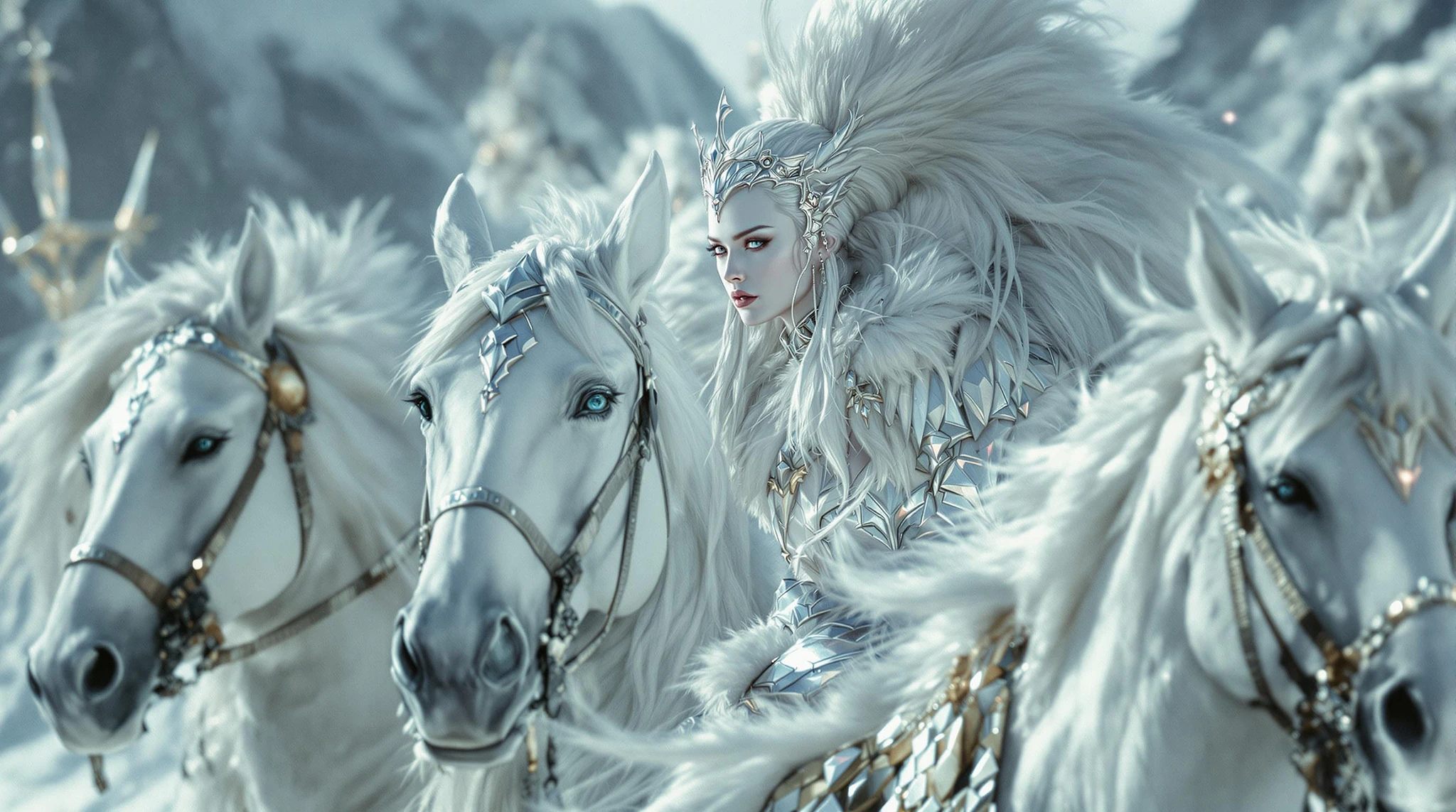 A grand fiction close up scene in a classic movie poster style, hyper realistic depicting valkyries, warriors woman , , on horses on white with scultured armoured horses, the skin is pale, the features sharp, and with white and silver iridescent clothing with thick fur contrasts with white and cool tones. The lighting is dramatic, with visible rich textures. Heroic elements and a massive scale are emphasized.