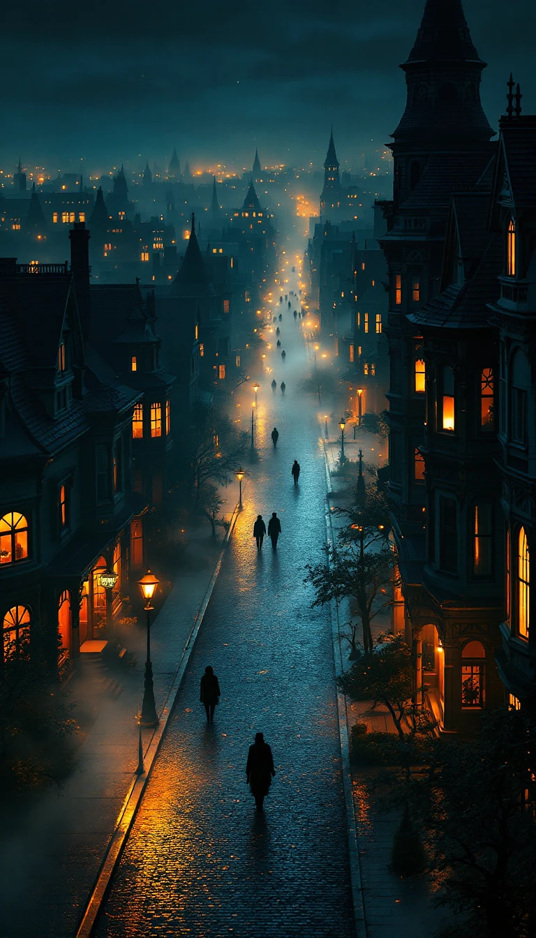 An eagle-eye view of a surreal Victorian town, captured at night under a pitch-black, starless sky. A wide cobblestone street stretches infinitely into the horizon, shrouded in faint, low-lying mist that swirls gently along the ground. Towering, vividly colored Victorian houses with ornate gables, bay windows, and intricate wooden trim line both sides of the street in perfect, mirror-like symmetry. Warm lights in shades of amber, gold, and faint crimson spill from countless windows, reflecting softly on the damp cobblestones. Some street lamps flicker subtly, while dark trees along the sidewalks whisper under an unseen breeze. The massive houses seem to lean inward slightly, as if conspiring, creating a dreamlike, faintly claustrophobic atmosphere. Tiny, silhouetted figures walk down the endless street, lost in an overwhelming, eerie silence that deepens the surreal sensation. The composition uses a slightly distorted wide-angle perspective, exaggerating the infinite vanishing point and immersing the viewer into a disorienting, cinematic dream.