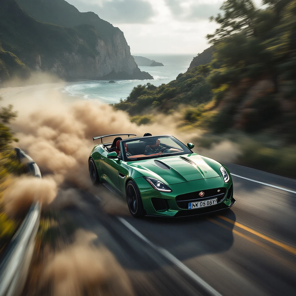 British racing green jaguar ftype convertible in a high-speed race on a winding beach front road, surrounded by lush greenery and dramatic cliffs, dust and tire smoke trailing behind the car, with a dynamic motion blur effect capturing its incredible speed from a drones perspective at 100 feet above