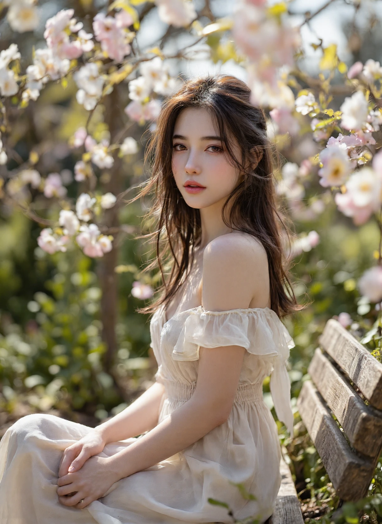 An ultra-realistic photograph captured with a Sony α7 III camera, equipped with an 85mm lens at F 1. 2 aperture setting, portraying a young woman sitting on a wooden bench in a sunlit park. The background is beautifully blurred, highlighting the subject. The park is adorned with lush greenery and blooming flowers, creating a serene atmosphere. Soft sunlight gracefully illuminates the subject’s face and hair, casting a dreamlike glow. The image, shot in high resolution and a 3:4 aspect ratio, captures the subject’s natural beauty and personality with stunning realism