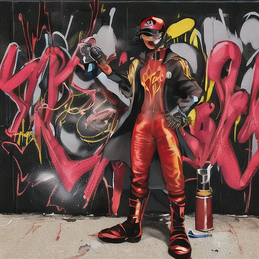 A black man in a red metallic superhero suit with gold gloves and yellow boots, black sunglasses with a red backwards baseball cap and holding two spraycans in front of a black wall with graffiti with the word ZOZ