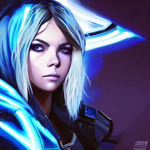ashley benson as scifi character with blackcyberpunk jacket with glowing blue details, short blue with yellow streaks hairstyle, ultra realistic digital art, highly detailed, digital painting, artstation, concept art, smooth, sharp focus, artgerm illustration, 8k, medium distance portrait pose camera shot