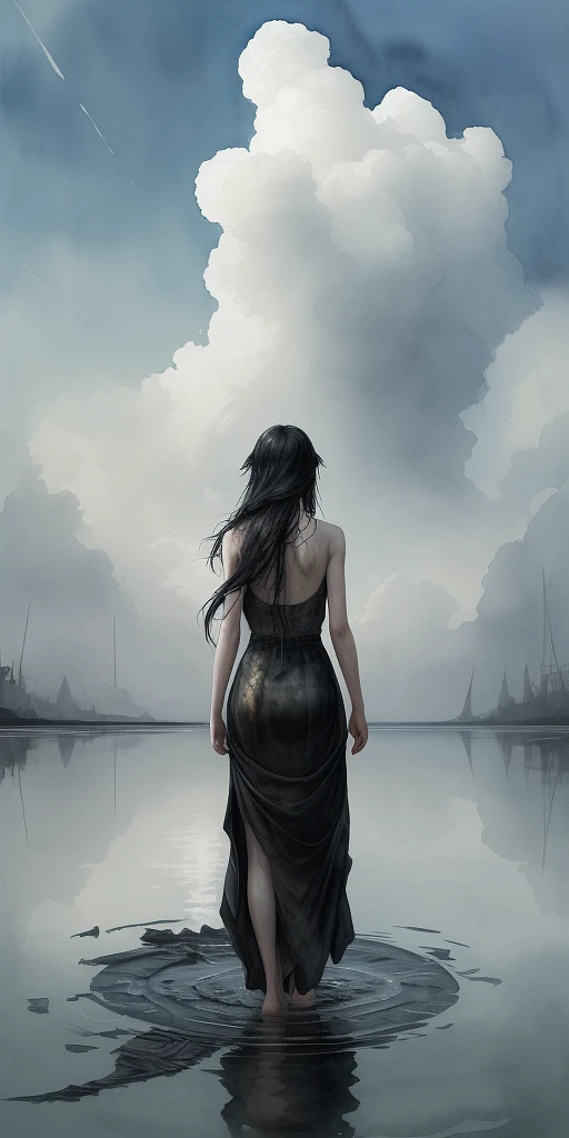 masterpiece, best quality, absurdres, illustration, watercolor, 1girl, solo, long hair, black hair, dress, skirt hold, wading, sleeveless, barefoot, bare shoulders, standing, from behind, outdoors, cloud, sky, dragon, water, dark zone,
