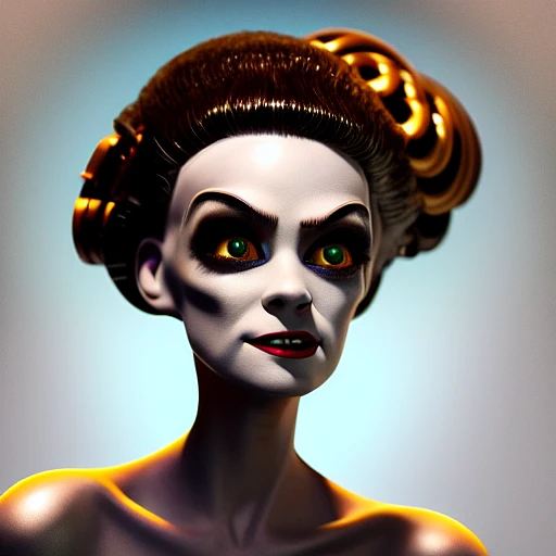 pixar portrait 8 k photo, beautiful shiny porcelain rich bride of frankenstein, college girl, long beautiful brown black , golden ratio details, retro horror movie, lomo, fantasy, cyberpunk, intricate, decadent, highly detailed, digital painting, ever after high, octane render, artstation, concept art, smooth, sharp focus, illustration