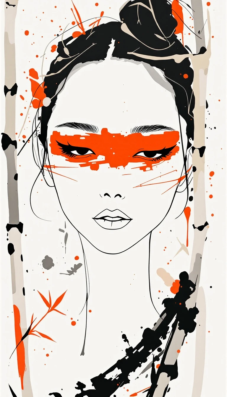 The minimalist drawing captures the essence of a colorful Japanese woman's white face with red eyeshadow, outlined in bold lines of dark beige and orange. The artwork is impeccable, with chaotic strokes set against a white background, crafting a striking, raw, and edgy portrait framed by mixed ink-colored bamboo patterns.