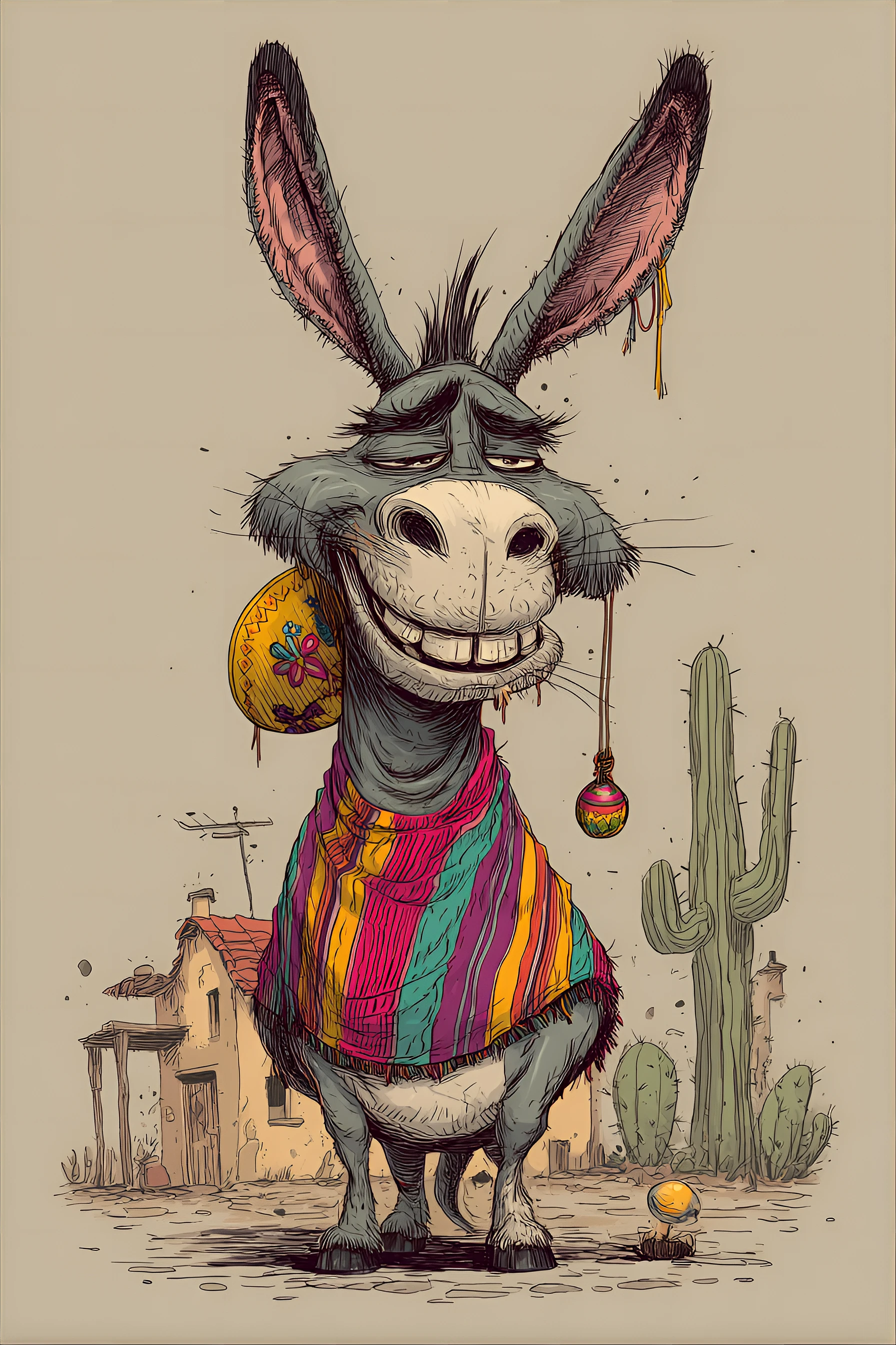 funny caricature, goofy donkey character, mexican ethnicity, 7 years old, lazy, friendly, stubborn, long face with exaggerated ears and a potbelly, exaggerated caricature, barrel-shaped body type, enormous ears, droopy eyes, buck teeth, sleepy smile expression, the donkey is wearing a colorful serape and a small sombrero, accessorized with maracas hanging from its neck, lounging pose
