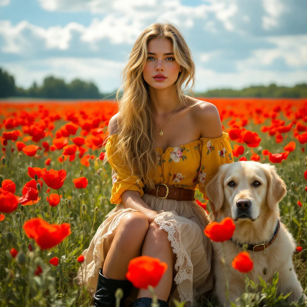 A young woman (caucasian, 20s) with long blonde hair sits in a field of vibrant red poppies, a golden retriever dog next to her. She wears a yellow, floral-printed, off-the-shoulder top with a brown leather belt. A light beige, layered, pleated skirt with lace trim falls around her. She wears black leather boots. The dog is light golden with a collar. The field stretches to a distant line of trees under a partly cloudy sky. The lighting is soft, warm, and highlights the subjects, with a sunlit glow across the flower field.   The composition is a medium shot, focusing on the woman and the dog, with the landscape as a backdrop. The colors are rich and realistic, capturing the vibrancy of the flowers and the warm tones of the day. Painterly style, photorealistic, detailed, 8k, art, illustration, golden retriever, romantic, classic portrait.